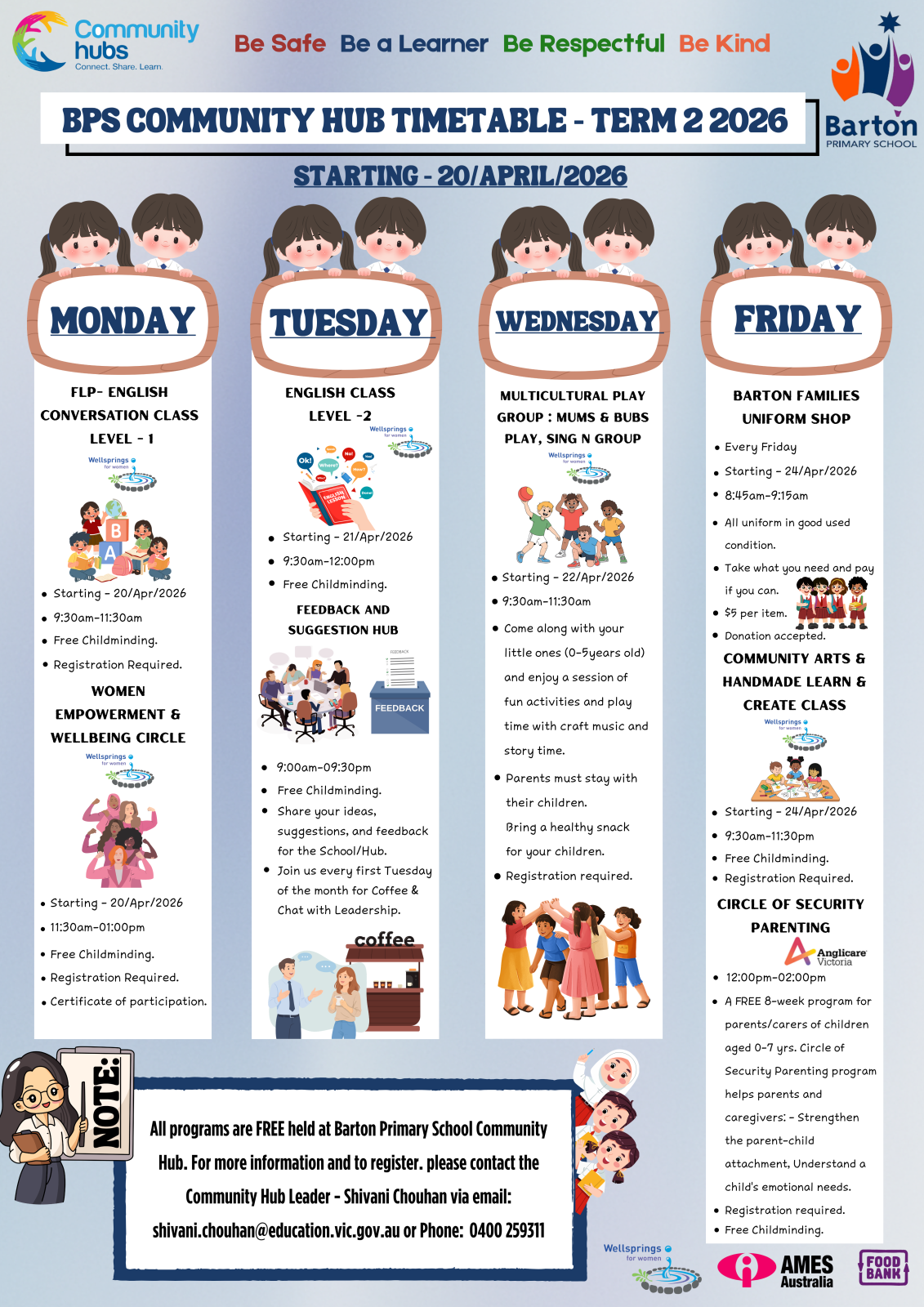 Families participating in our hub can engage in a variety of activities, from playgroups and social “Coffee and Chat” sessions to language and vocational skill-building sessions. These activities are designed to improve participants’ confidence, strengthen social connections, and contribute to better educational outcomes. At Barton Primary School, we believe that a thriving partnership between families, the school, and the broader community is essential for helping children reach their fullest potential. Our Community Hub supports this partnership through innovative programs, social connections, and active parent involvement in their children’s learning.